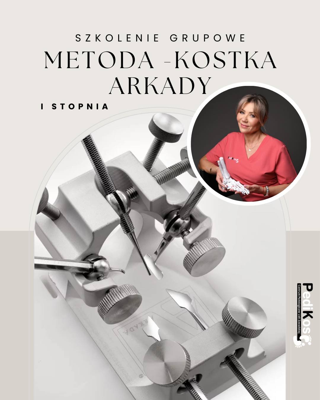 Metoda (Kostka) Arkady to jedyna na świecie nieinwazyjna technika leczenia wrastających paznokci, która łączy precyzję, skuteczność i komfort pacjenta. Specjalne urządzenie umożliwia stabilizację palca, precyzyjną korekcję paznokcia przy użyciu ruchomych manipulatorów oraz utrwalenie go antybakteryjną masą akrylową ze srebrem – efekt to natychmiastowa ulga, prawidłowy kształt paznokcia i estetyczny wygląd. Szkolenie daje unikalną szansę na opanowanie tej innowacyjnej metody, zwiększenie skuteczności leczenia w trudnych przypadkach i wyróżnienie swojej praktyki podologicznej na rynku.