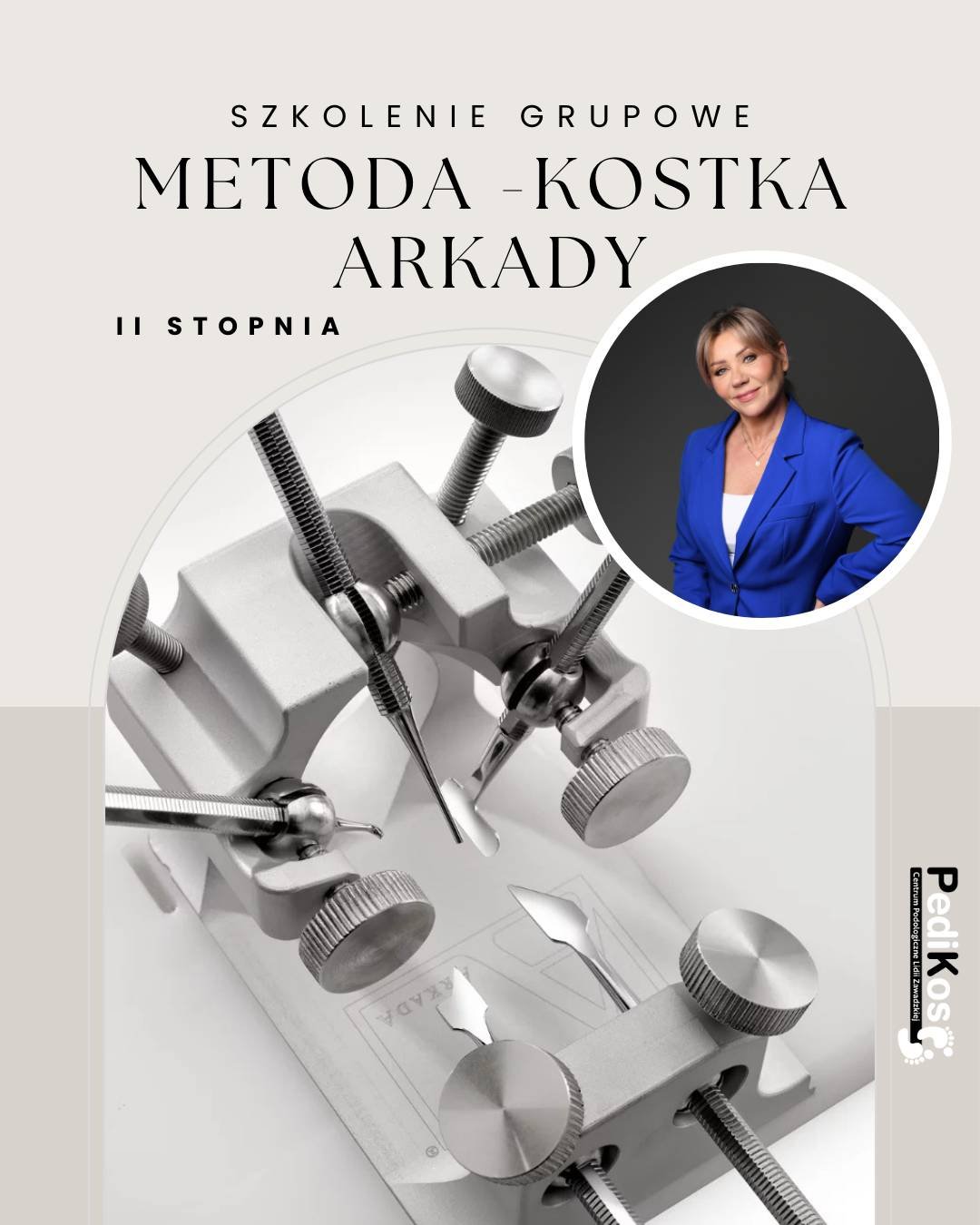Metoda (Kostka) Arkady to jedyna na świecie nieinwazyjna technika leczenia wrastających paznokci, która łączy precyzję, skuteczność i komfort pacjenta. Specjalne urządzenie umożliwia stabilizację palca, precyzyjną korekcję paznokcia przy użyciu ruchomych manipulatorów oraz utrwalenie go antybakteryjną masą akrylową ze srebrem – efekt to natychmiastowa ulga, prawidłowy kształt paznokcia i estetyczny wygląd. Szkolenie daje unikalną szansę na opanowanie tej innowacyjnej metody, zwiększenie skuteczności leczenia w trudnych przypadkach i wyróżnienie swojej praktyki podologicznej na rynku.